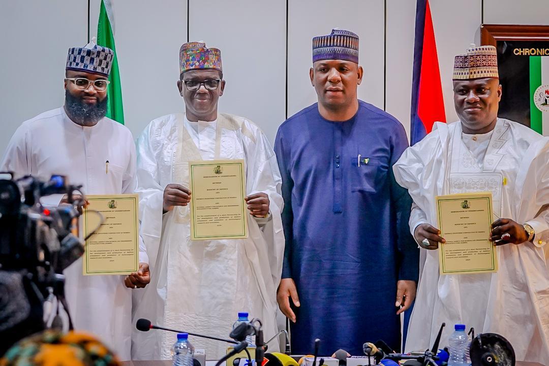 THE HONOURABLE MINISTER OF STATE FOR DEFENCE, H.E. DR. BELLO MUHAMMED MATAWALLE MON AND THE PERMANENT SECRETARY OF MINISTRY DEFENCE, DR. IBRAHIM ABUBAKAR KANA mni SIGNED MoU AND JOINT VENTURE AGREEMENT BETWEEN THE MINISTRY, DEFENCE INDUSTRIES CORPORATION OF NIGERIA (DICON) AND THE NATIONAL AGENCY FOR SCIENCE AND ENGINEERING INFRASTRUCTURE (NASENI) ON THE ESTABLISHMENT OF AMMUNITION PRODUCTION FACTORY IN NIGERIA ON WEDNESDAY, 13TH AUGUST 2024 AT SHIP HOUSE, ABUJA.