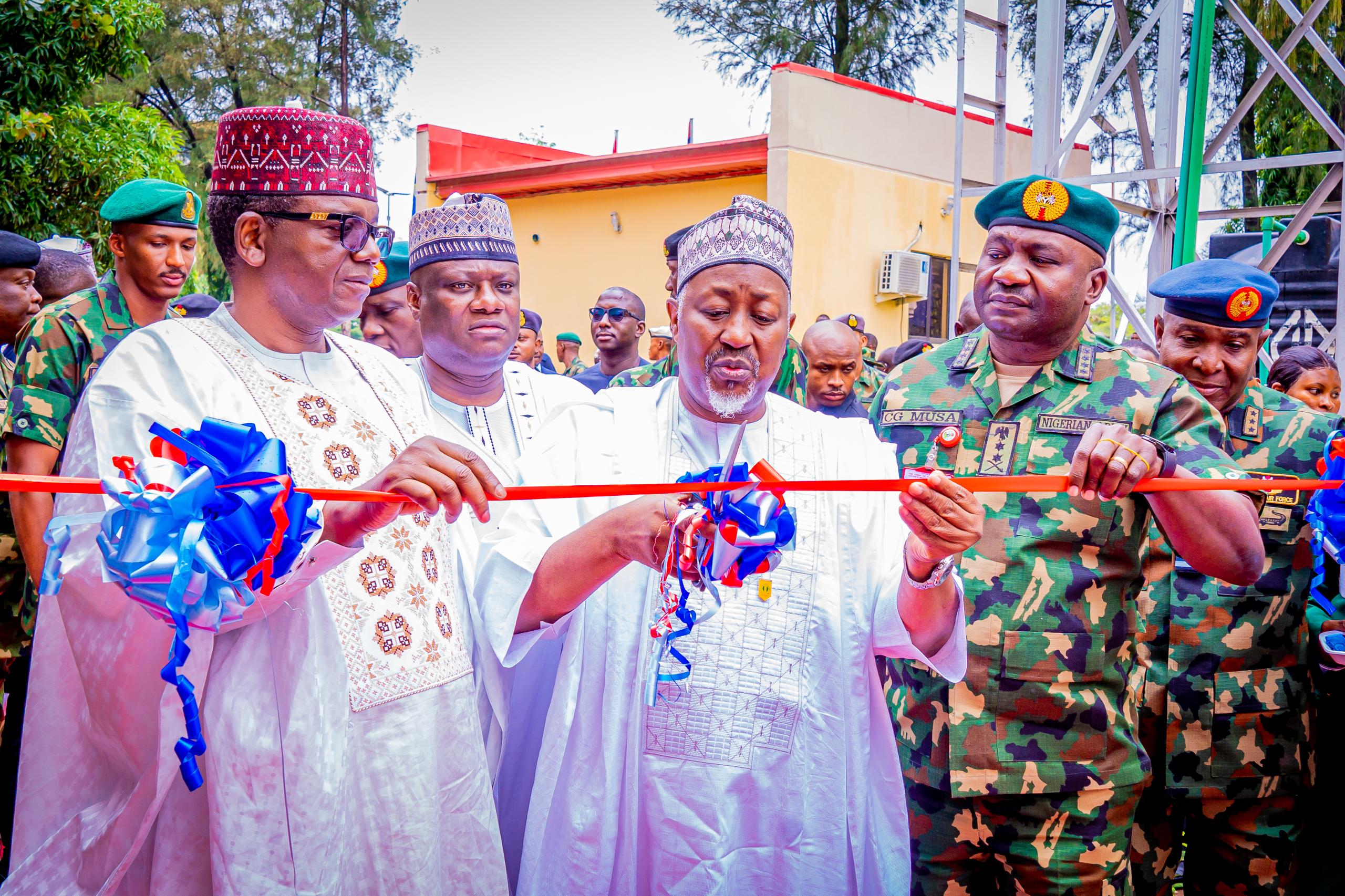 THE HONOURABLE MINISTER OF DEFENCE H.E. MOHAMMED BADARU ABUBAKAR CON, mni, THE HONOURABLE MINISTER OF STATE FOR DEFENCE H.E. DR. BELLO MUHAMMED MATAWALLE MON IN COMPANY OF THE PERMANENT SECRETARY, DR. IBRAHIM ABUBAKAR KANA mni AND SERVICE CHIEFS COMMISSIONED THE VICE ADMIRAL JUBRILA AYINLA BUILDING AND THE REMODELED ENTRANCE GATE OF THE NATIONAL DEFENCE COLLEGE ON TUESDAY, 20TH AUGUST 2024 AT THE NIGERIA DEFENCE COLLEGE, ABUJA.