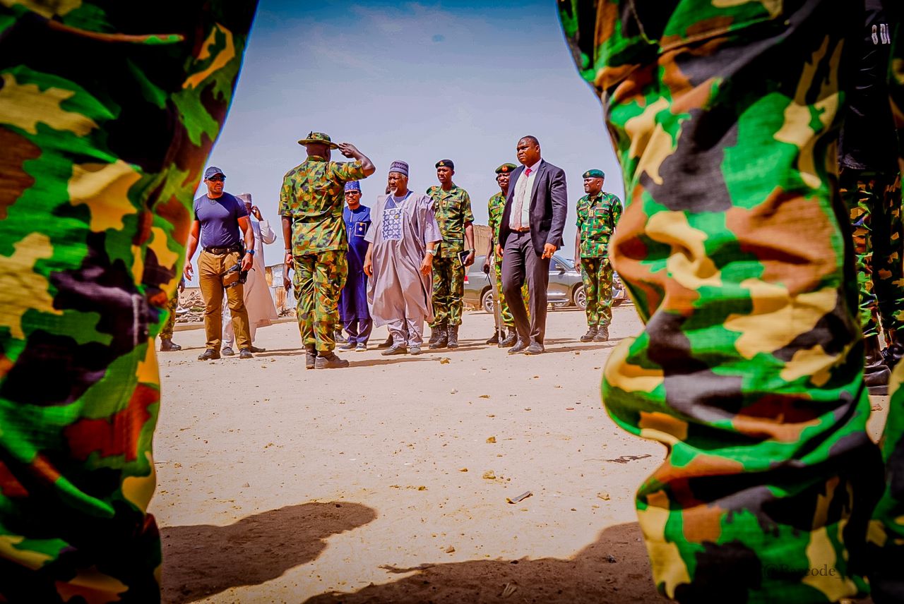 THE HONOURABLE MINISTER OF DEFENCE H. E. MOHAMMED BADARU ABUBAKAR CON, mni ALSO HAD A STOP OVER AT THE COMBAT 2, 17 BRIGADE ALONG TSAFE- SHEMA- GUSAU ROAD AND THE FORWARD OPERATION BASE IN ZAMFARA STATE.