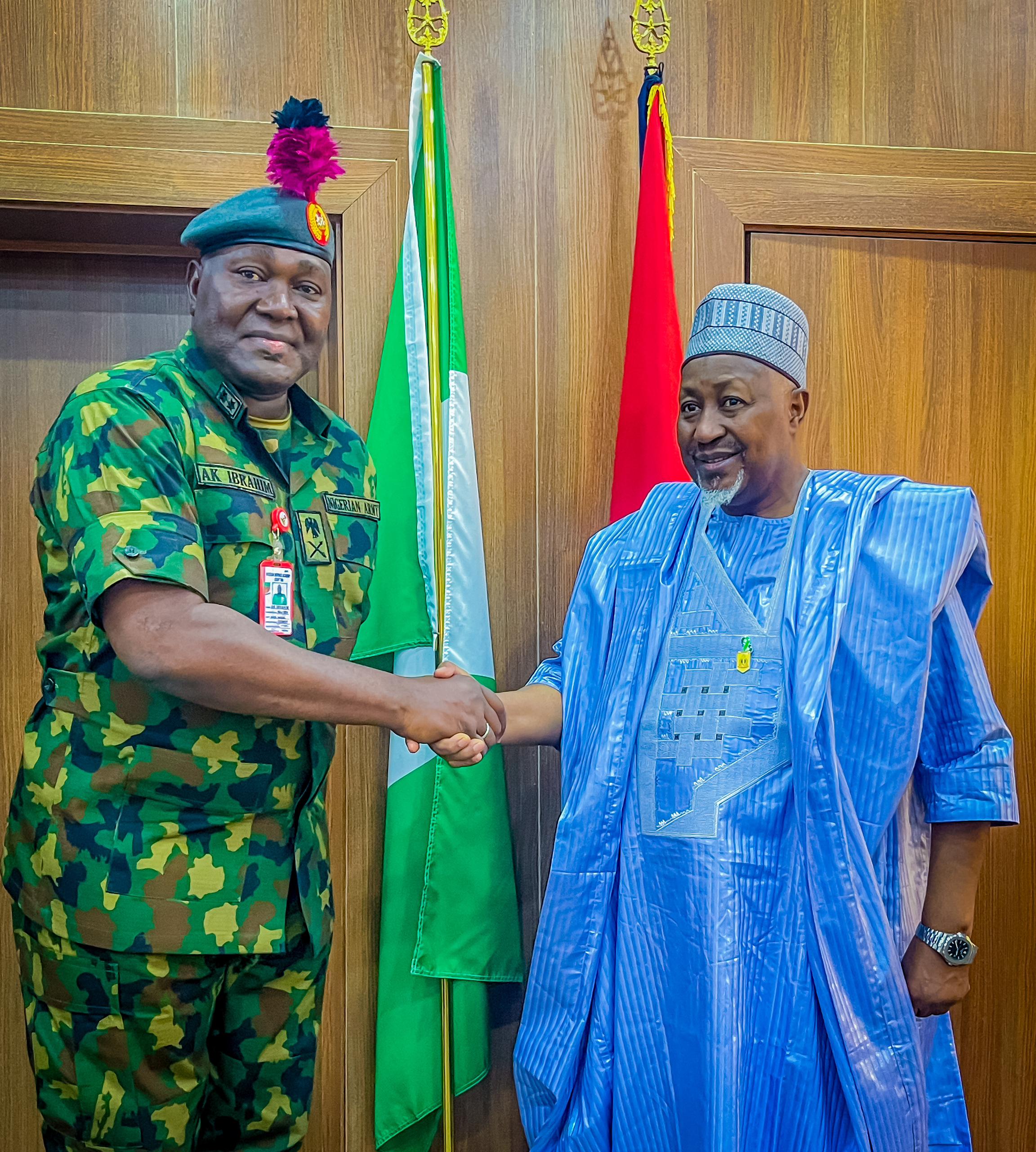 THE HONORABLE MINISTER OF DEFENCE H.E. MOHAMMED BADARU ABUBAKAR, CON, mni, RECEIVED THE NEWLY APPOINTED COMMANDANT OF THE NIGERIAN DEFENCE ACADEMY (NDA), KADUNA, MAJOR GENERAL A.K. IBRAHIM, WHO PAID HIM A COURTESY VISIT AT HIS OFFICE IN THE MINISTRY OF DEFENCE, SHIP HOUSE, ABUJA, ON TUESDAY, 7 MARCH 2025.