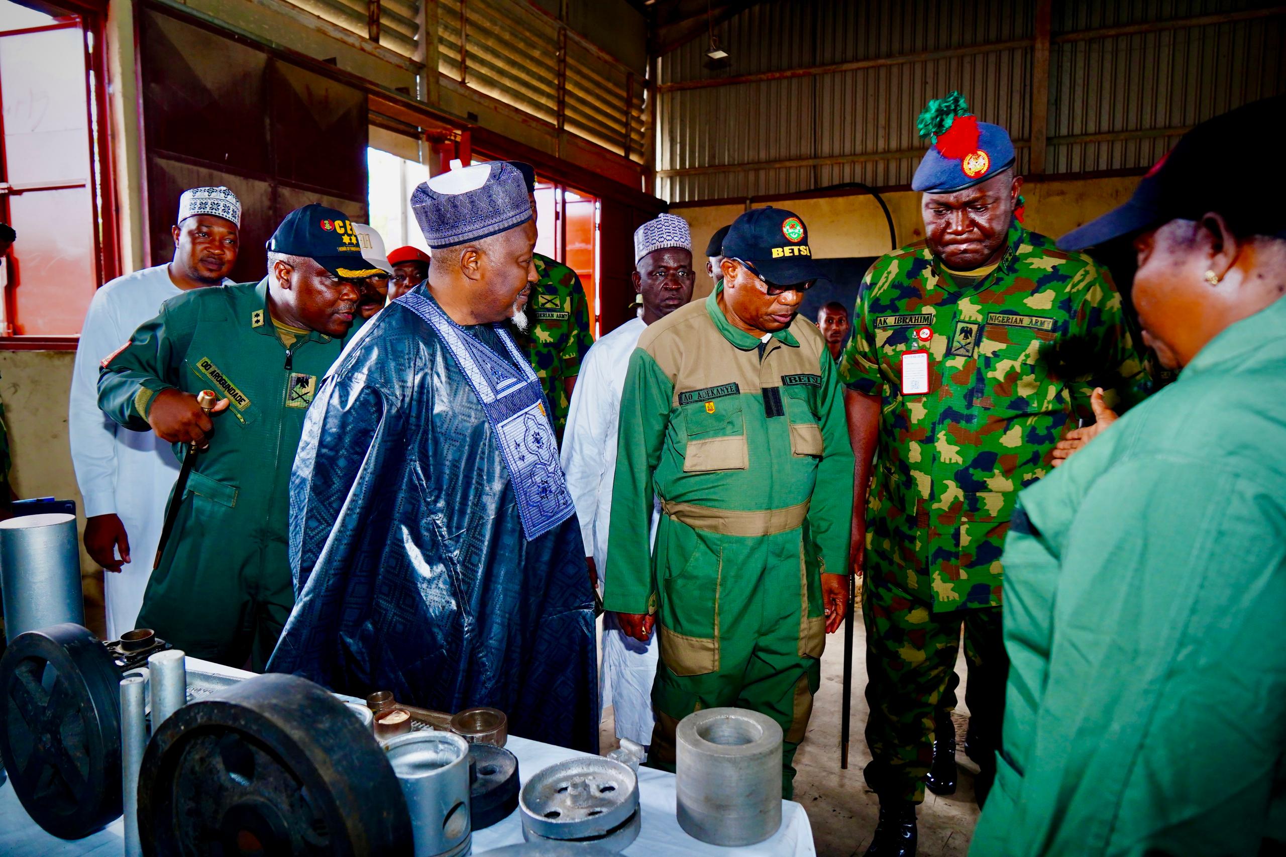 Accompanied by senior military officials, including Major General M.L.D. Saraso, General Officer Commanding (GOC) 1 Division; Major General A.K. Ibrahim, Commandant of the Nigerian Defence Academy; and Air Vice Marshal Sani Labaran Rabe, Commandant of AFIT, the Minister engaged with personnel and observed the advancements in military training and production.