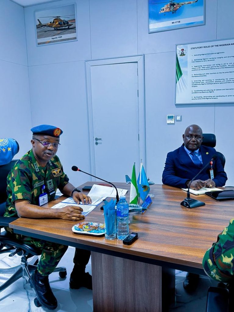 In continuation of his familiarization tour to the Services in the Ministry of Defence , the Permanent Secretary, Ministry of Defence Mr Richard Pheelangwa visited the Chief of the Air Force, Air Marshal Sunday Kelvin Aneke at the Air Force headquarters in Abuja.