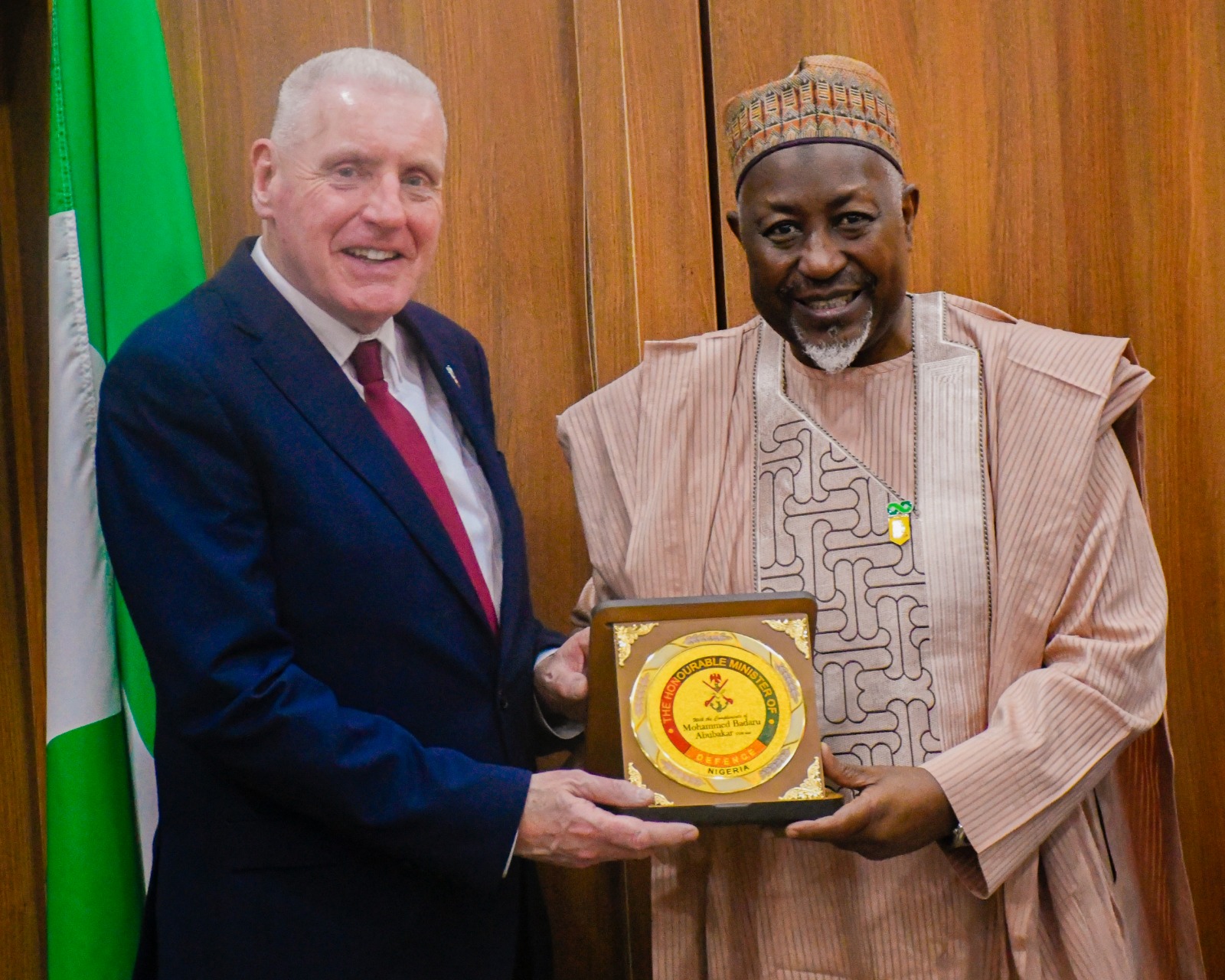 THE HONOURABLE MINISTER OF DEFENCE H.E. MOHAMMED BADARU ABUBAKAR CON, mini HAD AUDIENCE WITH THE UNITED KINGDOM MINISTER OF ARMED FORCES LORD COAKER AT SHIP HOUSE IN ABUJA.